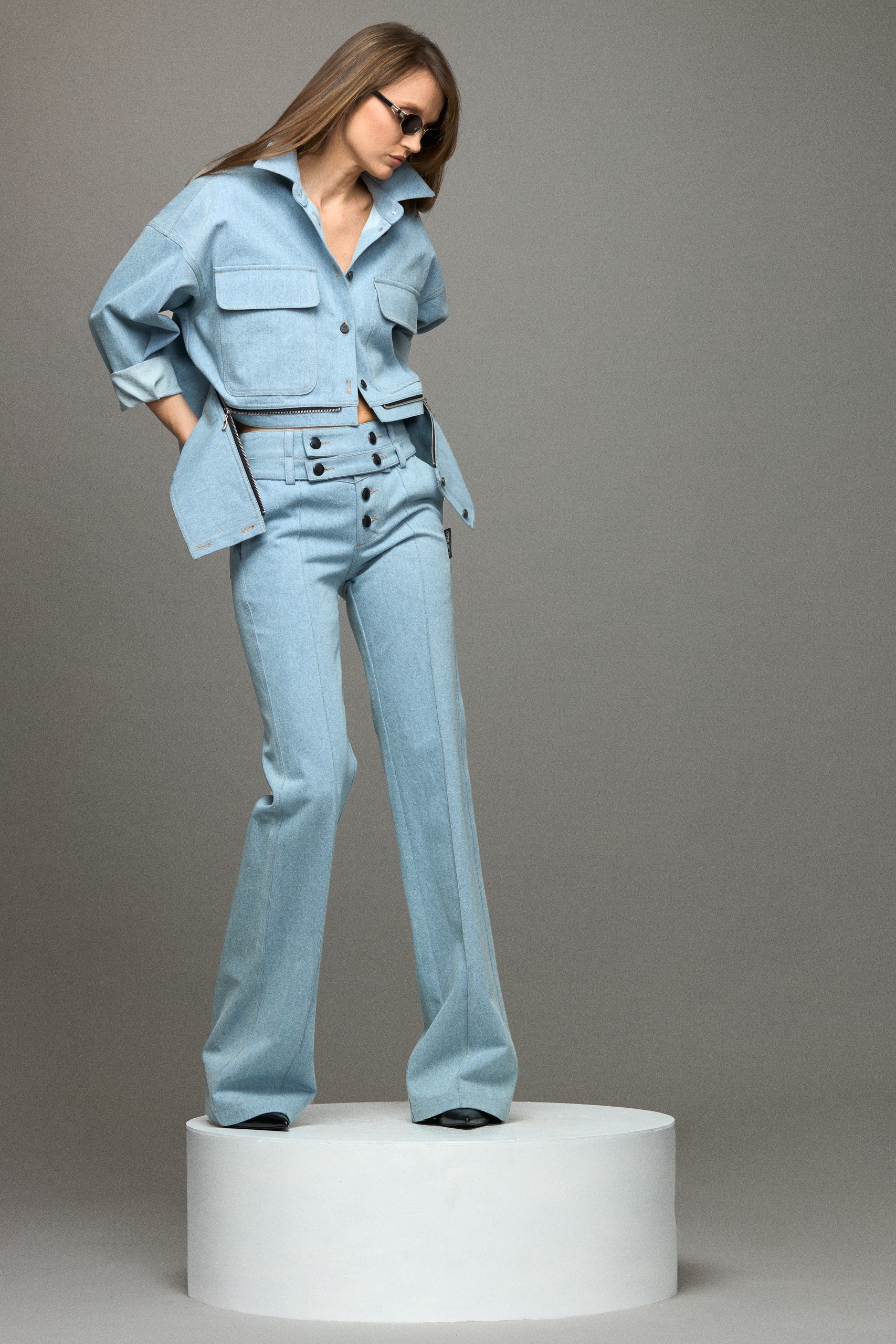 • Denim jacket fastens with metal buttons at the front