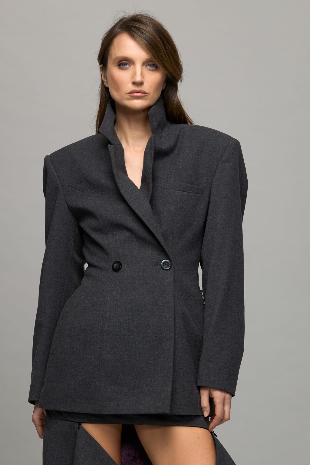 • The skirt fastens with a double-breasted closure, buttons