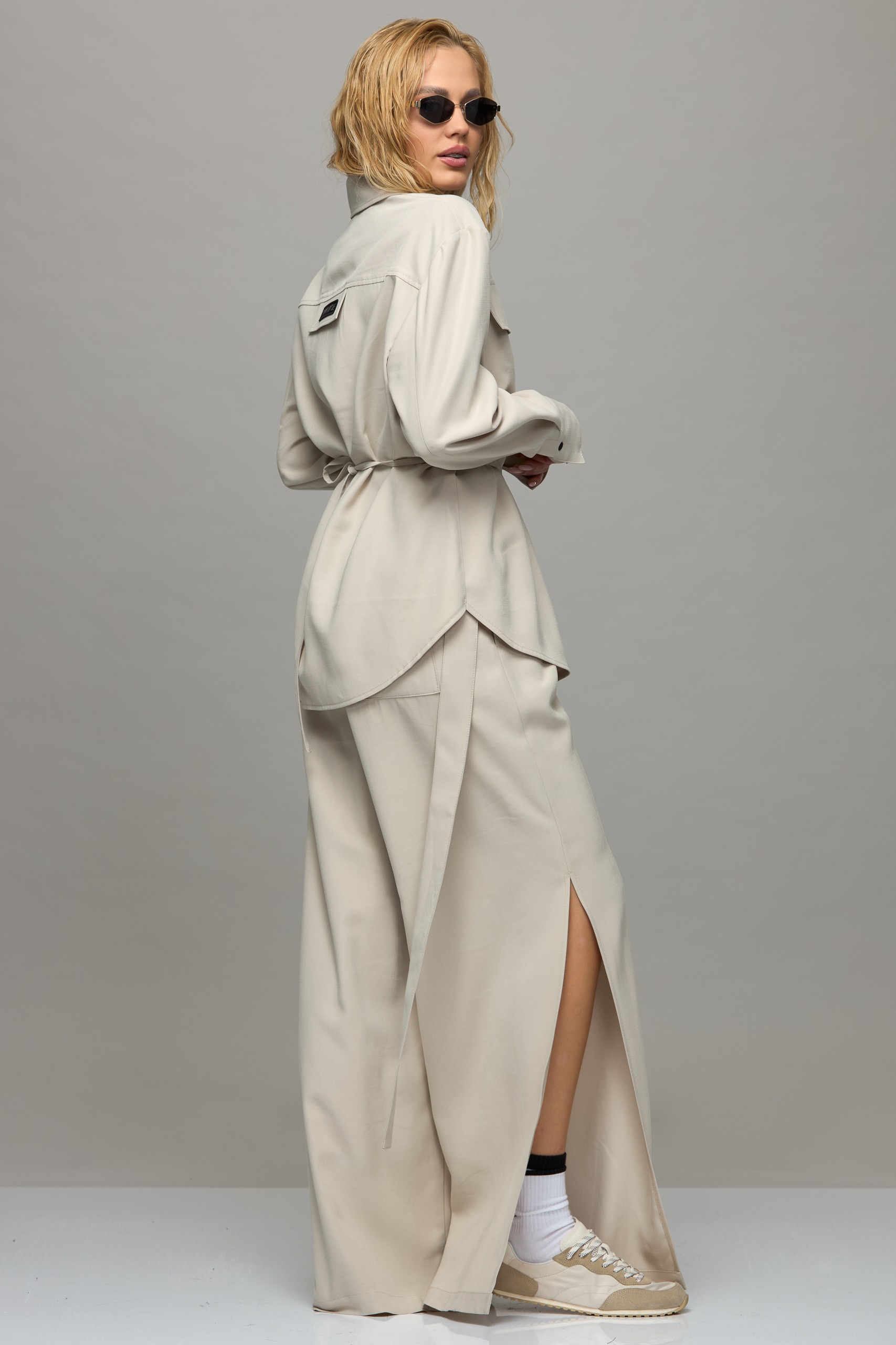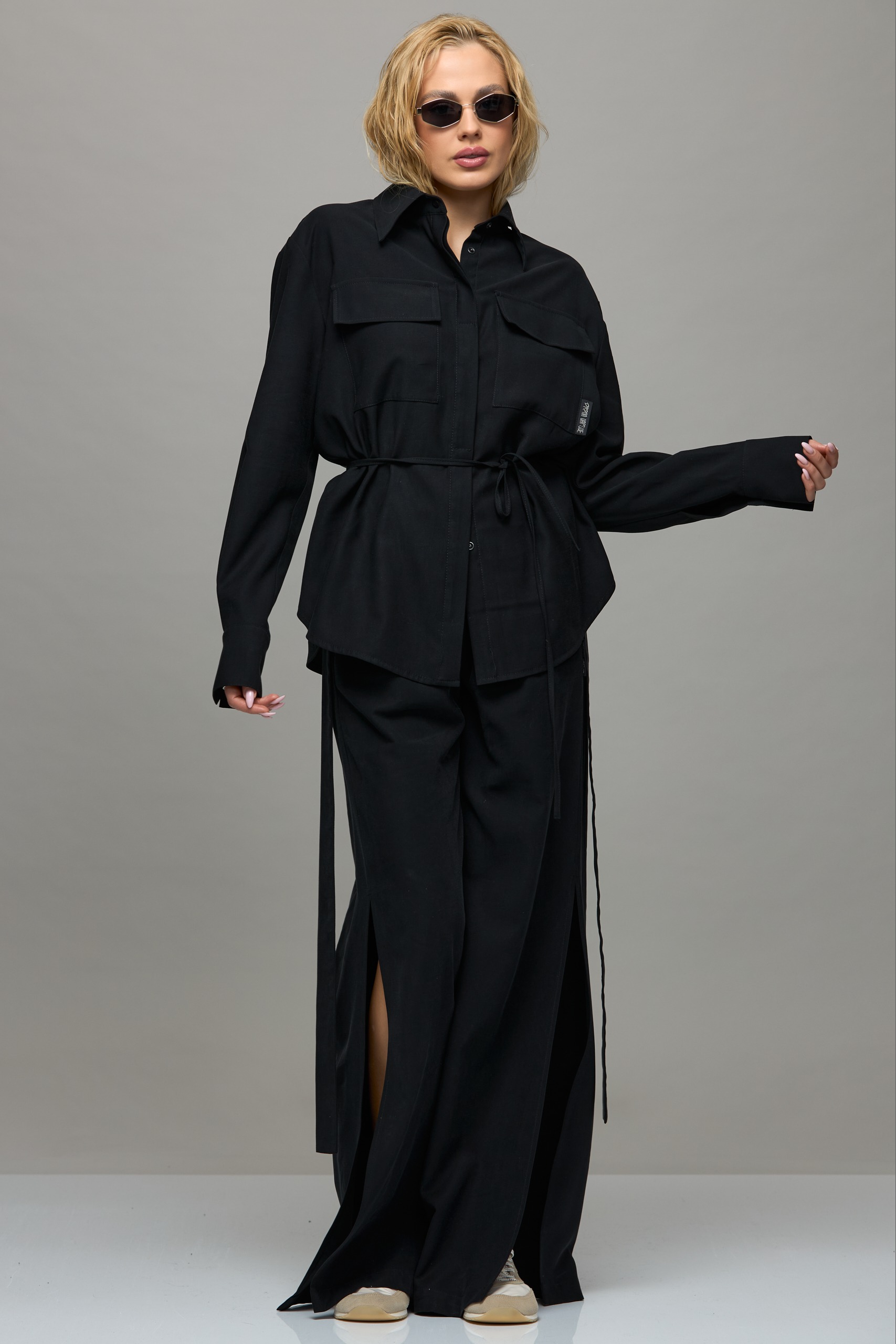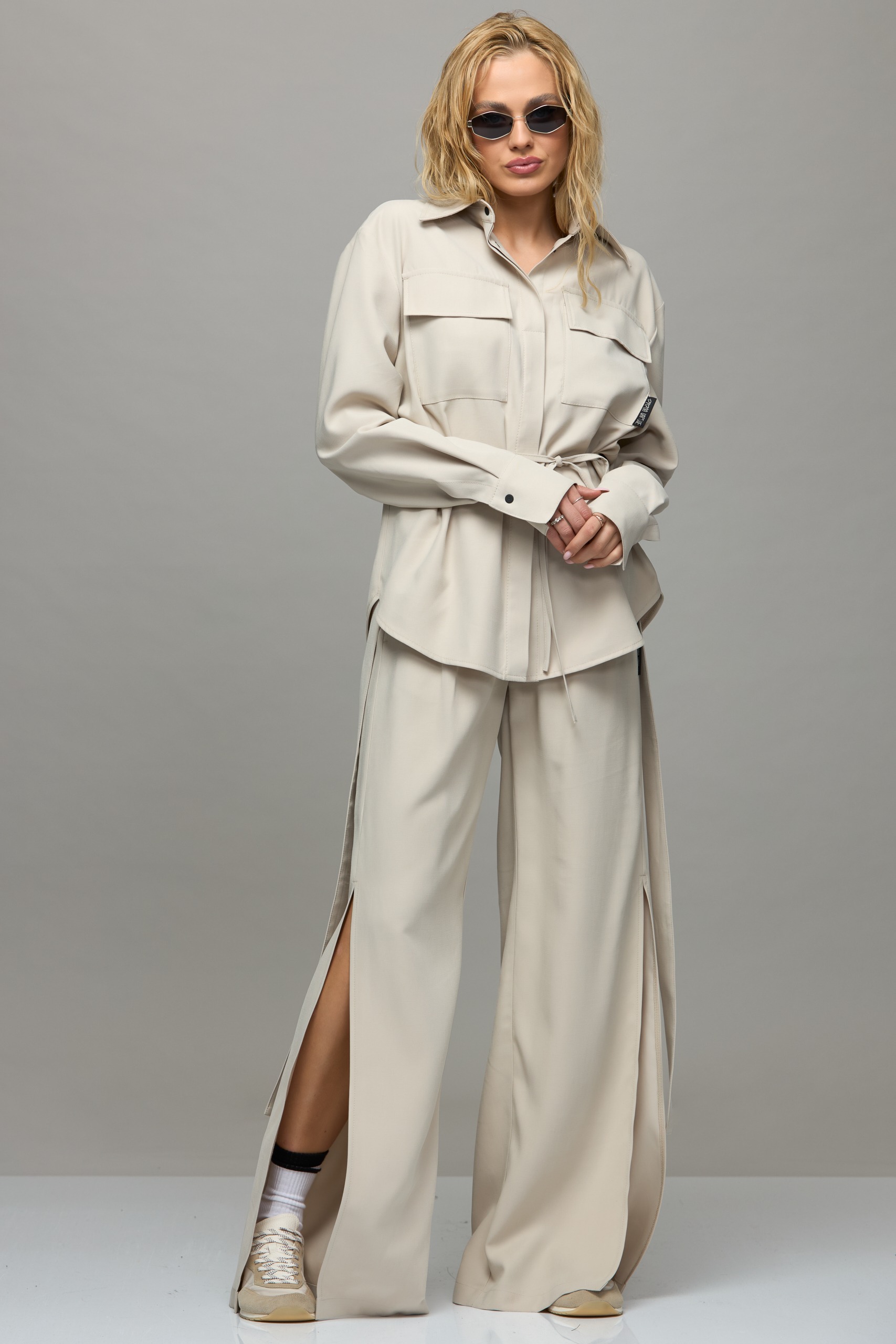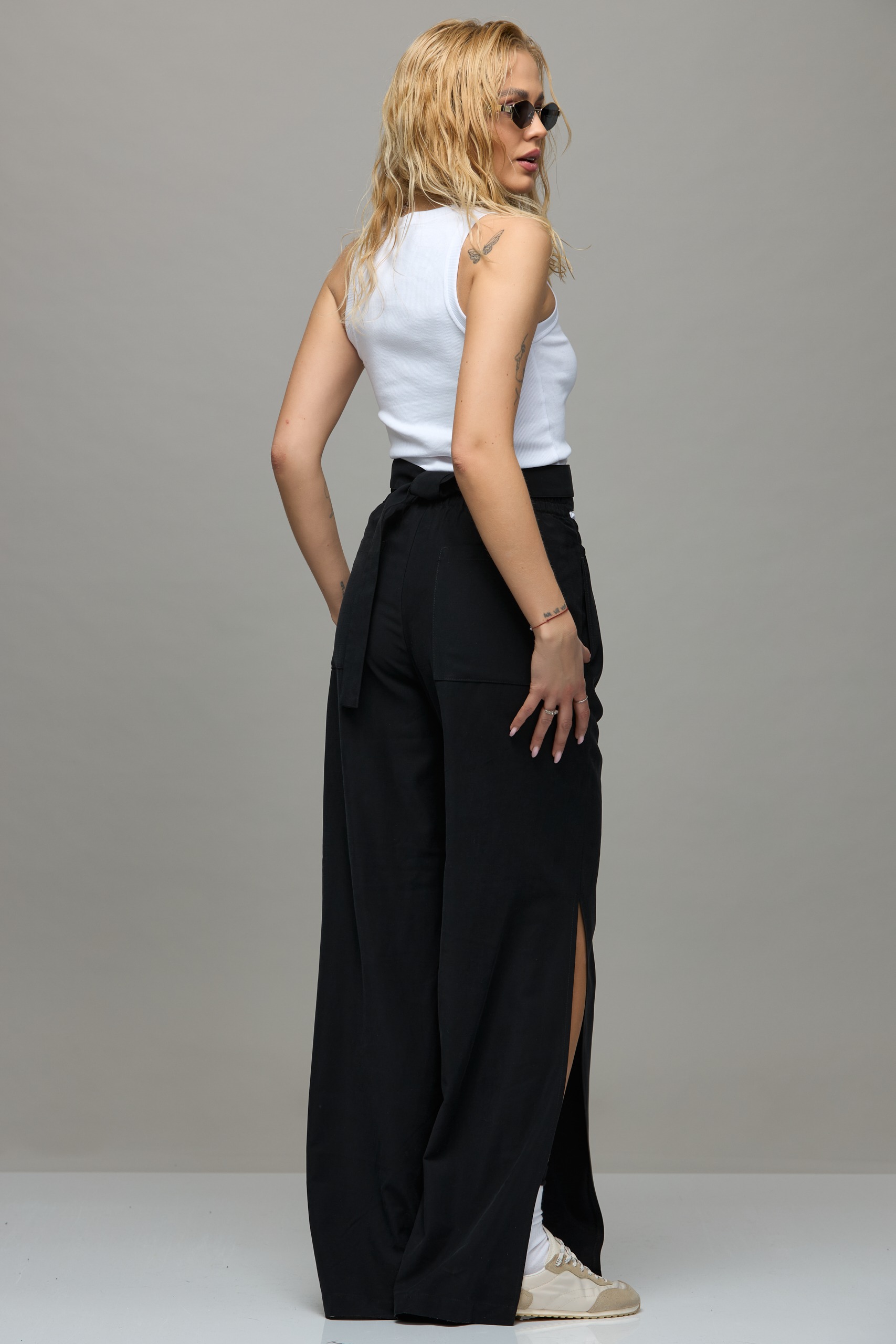 - The waist of the pants has an additional belt that can be wrapped around the waist, which gives the pants a double-waist silhouette